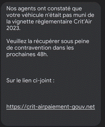 Arnaque à la vignette CRIT’AIR par SMS